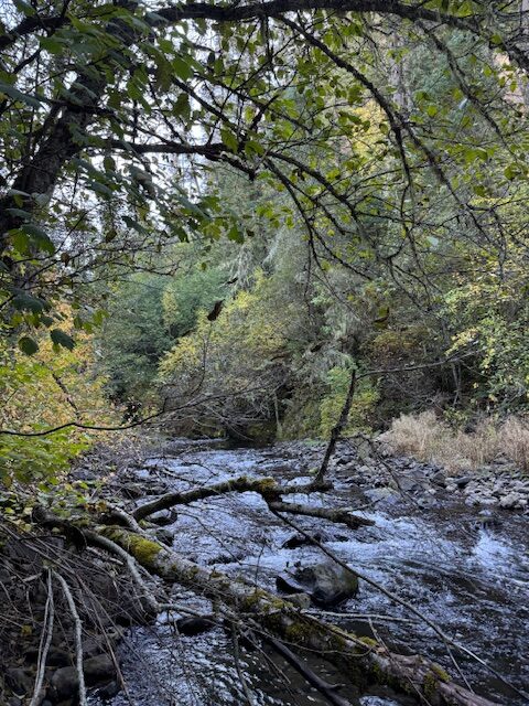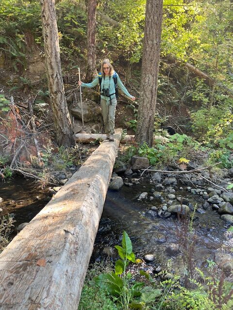On the river trail, we paused often to marvel at the log jams and channels, a beneficial aftermath of floods in February of 2020. Downed trees add nutrients and shelter for fish. Cottonwoods need flooding for seeds to sprout. Marilyn pointed to a deep pool below the log jam as ideal for an idling bull trout. A threatened species in Oregon, the trout depends on cold, clear, and connected waters. Importantly, a number of tributaries to the North Fork Umatilla, outside of protected Wilderness, are included in the River Democracy Act.