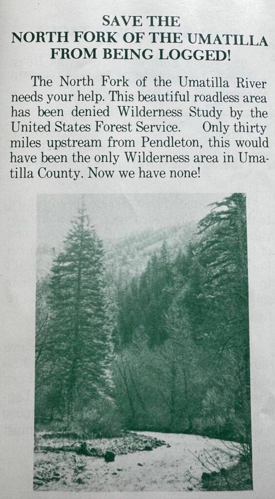 Marilyn has saved a lot of files from her days as an activist. Before our walk, Marilyn handed me a 1980 MEOW brochure with the headline in all caps, “Save the North Fork of the Umatilla From Being Logged.” Then, the Forest Service had denied Wilderness Study status, and instead tallied a potential 135 million board feet they could log from 10,000 acres—much of it steep with sensitive soils. Timber sales were in the works.